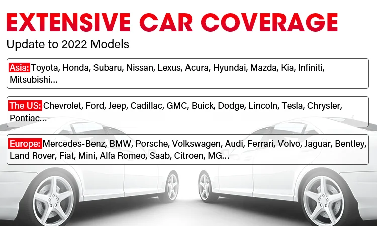 10. Cobertura de más de 10000 modelos de vehículos: Amplios servicios de diagnóstico y reparación para miles de vehículos asiáticos, europeos y americanos, compatible con los protocolos CAN FD y DoIP más nuevos, compatible con FCA Autoauth.