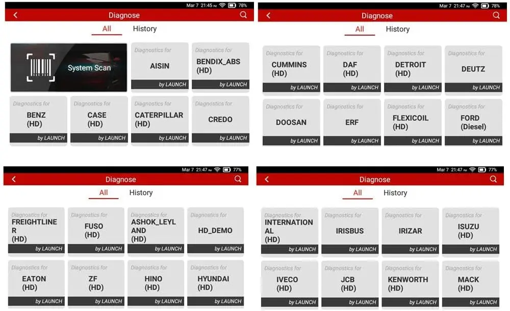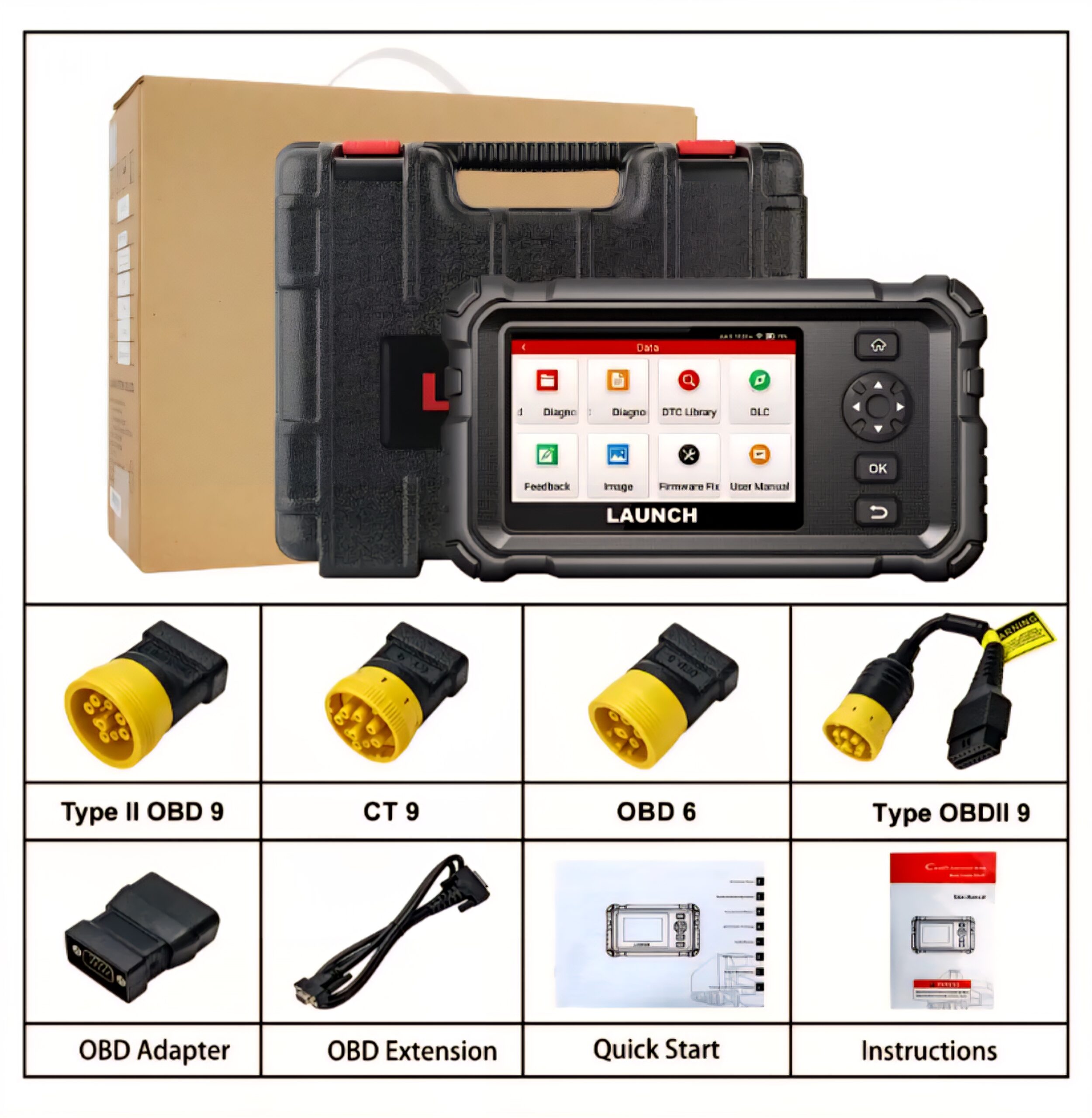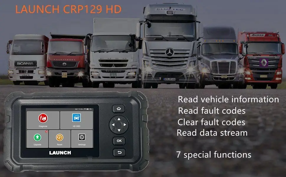 El escáner 129HD admite más de 50 modelos de vehículos, como camiones/pesados, camionetas, autobuses, remolques, tractores, voladores, vehículos agrícolas y de construcción.